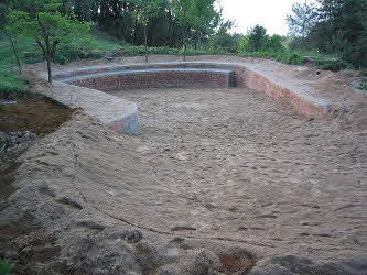 Hier soll ein Naturteich entstehen. In einem kleinen Waldstück soll das Bauvorhaben Naturteich in die Tat umgesetzt werden. Aushub des Naturteich erfolgte mit einem Bagger. Danach wurde der hintere Bereich gemauert. Die Form des Naturteich kann jeder individuell bestimmen . Der Naturteich soll mit einer EPDM Folie gebaut werden. Zum Schutz der Folie wird in den Teich ein Schutzvlies eingearbeitet. In den Naturteich werden jetzt noch nach und nach Pflanzen eingesetzt. |